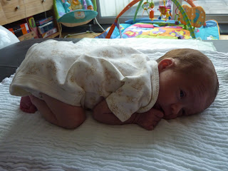 I have to share with you my two favourite things to do....first, I love "tummy time" where Mom and Dad let me spend 5 minutes a day on my tummy. I can even move my head from side to side (though it takes me a few minutes to do so). I also learnt how to blow bubbles with my spit this week--fascinating!
