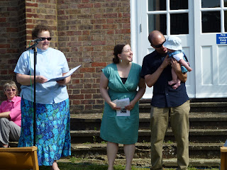 Last Sunday, I had my blessing at the Welwyn Garden City Free Church. The service was held outside which was really nice as it was very hot and sunny. Mommy dressed both Daddy and I in outfits that would match. I was sooo good. When Pastor Jane held me up and brought me around the congregation--I didn't cry at all!