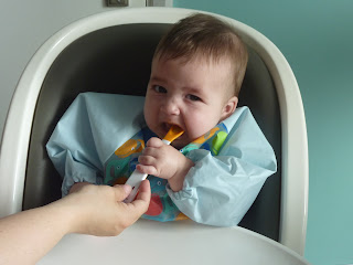 Great pics. How did the rice go? Did he eat any? I guess you decided to do a mix of English and Canadian feeding. It can be a little over whelming when you have sooo much different information. The best advice I can give you is to test food for a week before introducing the next one. We did one cereal a week for 3 or 4weeks and then started 1 cereal for breakfast, a different cereal for lunch with a veggie, then another cereal for supper for a week than went on to a different veggie. It was a long process but Denis started his cereals at 4.5 months cause the bottle wasn't enough for him. Have fun and you'll know if Liam isn't ready for solids and you'll REALLY know when he doesn't like something