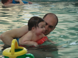 | The water is usually nice and warm. Here I am swimming forward on a floatie. Here I am about to jump into Daddy's arms. |
