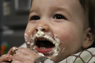 I ate a lovely birthday dinner--salmon fishcakes! For dessert, Mommy brought a cake for me...a banana cupcake topped with whipped cream! I made a real mess!