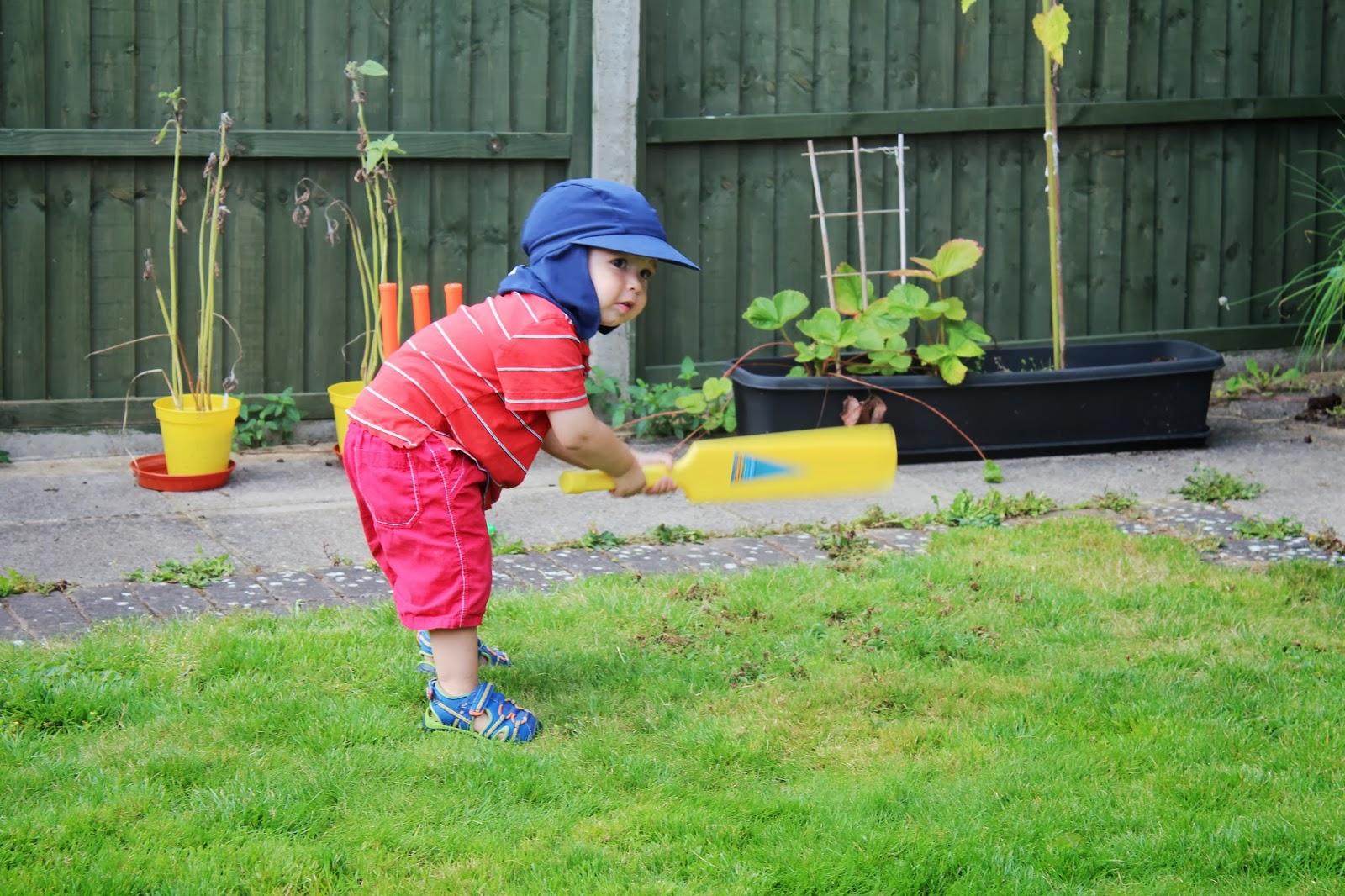 Here I am playing cricket with Daddy and Uncle Jamie. I get to play now that I can hit a ball accurately. |
