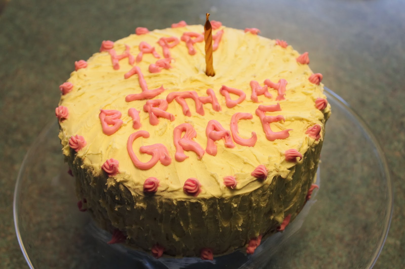 | Here is my birthday cake (Mommy's favourite--a cherry cake)--Mommy made a special one for me. |