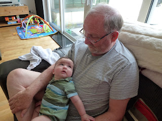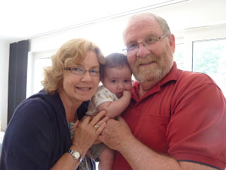 New Things I can do: Ican roll from my back to my tummy. I do this so often I now have to sleep on my tummy as I kept on squirming and moving in bed (and getting my legs and arms caught in the cotbed!). I can also go swimming in the big pool with Mom and Dad. They hold on to me still but I love it!