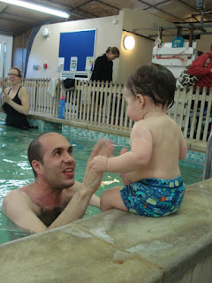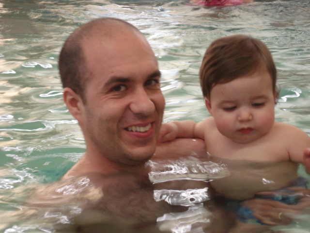 | The water is usually nice and warm. Here I am swimming forward on a floatie. Here I am about to jump into Daddy's arms. |