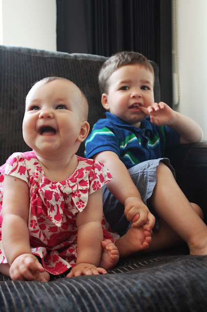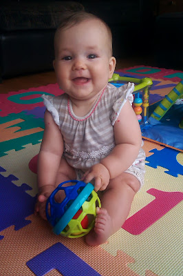 New Things I Can Do: I can now roll over from my back to my tummy--but only when I want to! I can now bounce up and down on my legs when held--that's why I'm loving the jumperoo and my dj toy at the moment! I now only have 2 naps during the day but I sleep from 7pm to 7 am. I talk a lot--a do some "ba..ba..." sounds. I no longer mind playing on my tummy and I love hitting musical balls and cubes around. Everything goes in my mouth--including my toes! I sit up by myself now so I can eat in almost any kind of highchair. I really interact now with Liam---he makes me laugh so much!