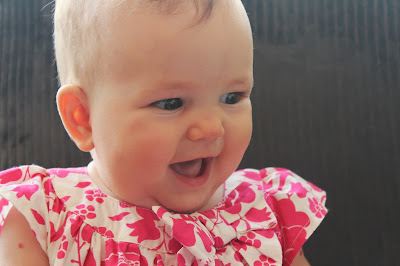 Funny Things I Do: I'm smiling and laughing all the time during baths. I go wild trying to get hold of things--playing with my curtain and muslins! I'm also always moving in my highchair--never looking at the person who is feeding me and shaking my head "dancing" side to side. I love playing outside and trying to "get" Liam.