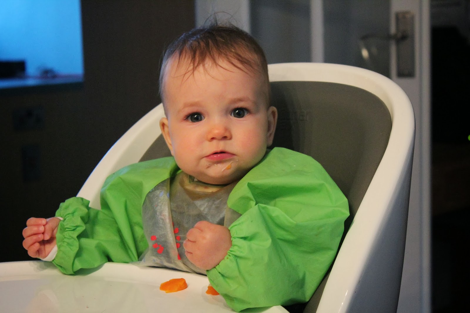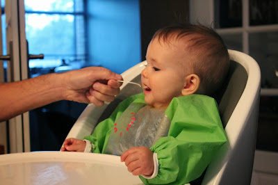 New Things I Can Do: I'm really starting to pay attention to you when you're talking. I love it when you point out the different parts to my face. I know where my head is when asked. I dance when "Baa, Baa blacksheep" is sung and I clap my hands for "If You're Happy and You Know it, Clap Your Hands." I can get from sitting to tummy position easily. I can also swivel around on my bottom. I'm always reaching out and trying to pull myself up to standing position. I can feed myself and I can help myself get dressed. I love throwing everything--including food!